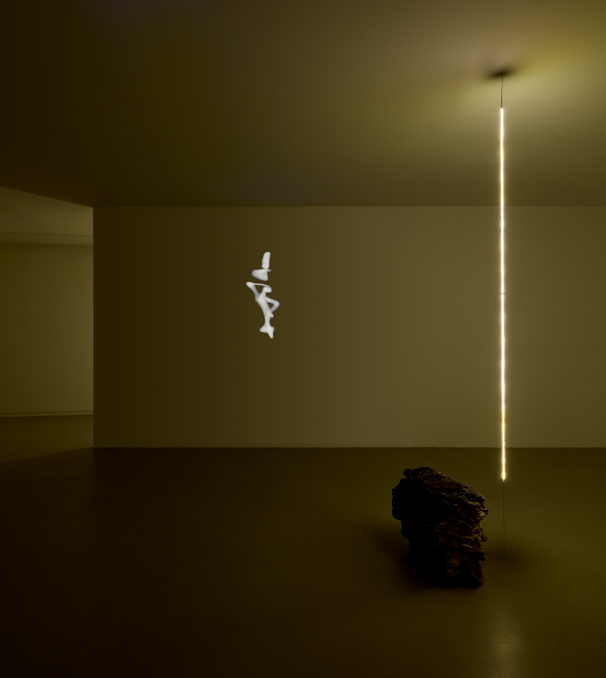 전시장 곳곳에는 총 네 개의 바위가 놓여 있다. 마치 번개를 맞은 듯 필라멘트 조명의 빛과 맞닿아 있는 이 돌들은 각각 ‘산’, ‘코끼리’, ‘사자’, ‘용’이란 별명을 지니고 있다. 그 형상과 모습이 닮아 이름붙기도 했지만, 한국의 애니미즘 사상을 반영하고 있기도 하다. 야외정원과 마주한 벽을 통해 상영되는 비디오 작업 ‘물고기가 입맞추는 달(Fish Trying to Kiss the Moon)’은 작가가 경주 월지에서 만난 연못에 드리운 달과 물고기를 시적으로 담아낸 것이다.