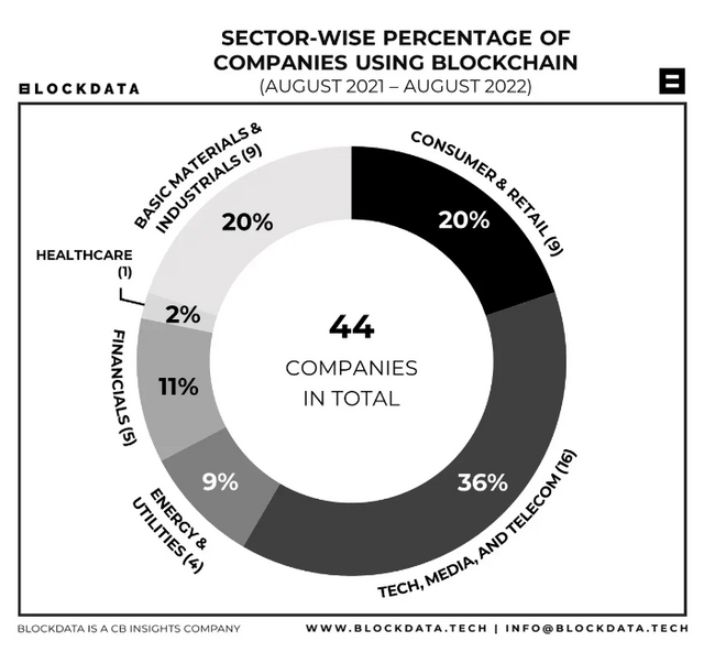 온체인 데이터 분석 플랫폼 블록데이터 보고서에 따르면 현재 시가총액 100개 상장 기업 중 44개가 어떤 형태로든 블록체인을 적극적으로 활용하고 있었다.