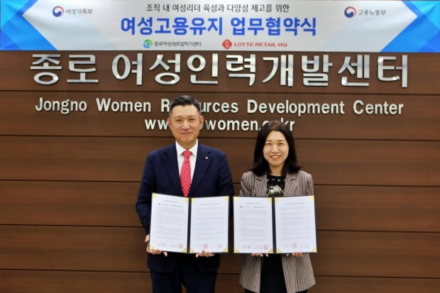 롯데유통군은 센터와 여성 고용유지를 위한 업무협약을 맺고 여성들의 경력 단절을 막고 재직 중 경력 개발 등을 지원하기 위한 다양한 방안을 모색해나갈 예정이다.