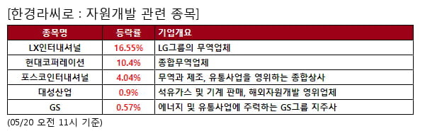 한경라씨로의 빅데이터 분석에 따르면, 05월 20일 자원개발,석탄,전력설비,LS,구리에 대한 투자자들의 관심이 높은 것으로 나타났다. 이 중 자원개발 관련 종목은 평균 6.5%의 상승세를 보이고 있다. 자원개발 관련 종목으로는 LX인터내셔널,현대코퍼레이션,포스코인터내셔널,대성산업,GS 등이 대표적인 종목으로 꼽히고 있다.