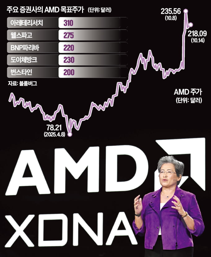 이에 따라 월가에선 AI 칩 시장에서 AMD가 엔비디아의 독주를 무너뜨릴 가능성도 조심스레 제기하고 있다. 반도체 리서치업체 아레테리서치는 최근 AMD 목표 주가를 230달러에서 310달러로 상향 조정했다. 오픈AI 등과의 파트너십이 AMD에 안정적 수요 기반을 제공할 가능성이 커졌다는 게 아레테리서치 분석이다.